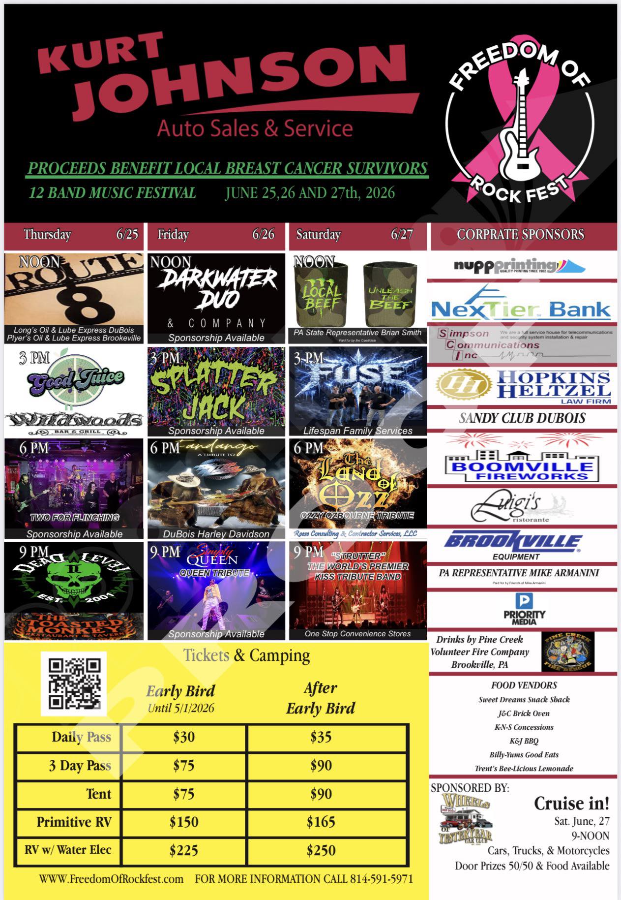 The first-ever Freedom of Rock Fest 2026 will be held Thursday June 25, Friday June 26th, and Saturday June 27th, 2026, The event will be held at the Jefferson County Fairgrounds in Brookville, PA. rain or shine! Current pricing will stay in effect until Midnight on May 1st 2026 when All Ticket Prices will go up.